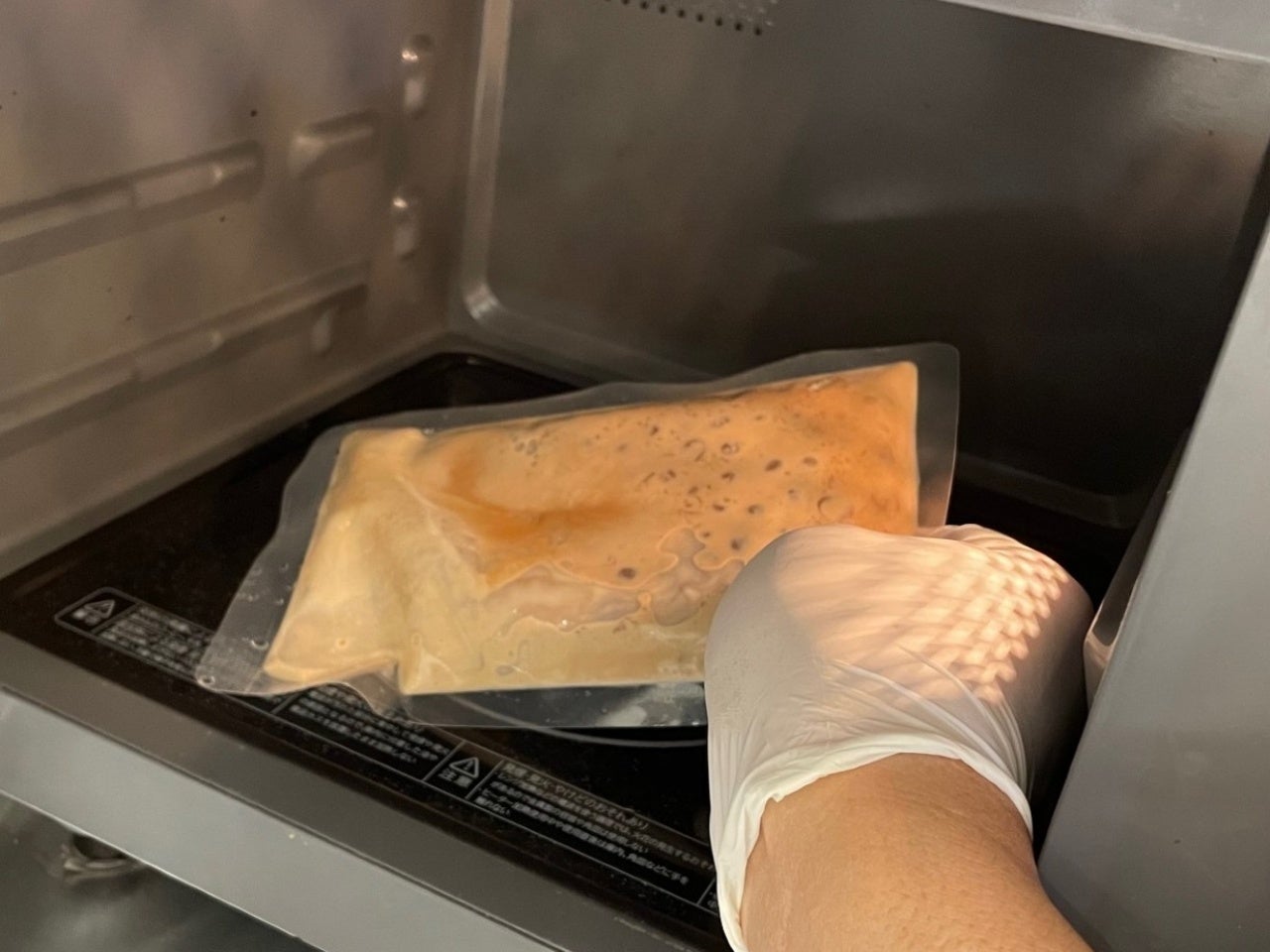 ①レンジで加熱解凍します。500Wで1分~1分30秒が目安、タピオカに透明感が出てやわらかくなったらOKです。注文が多い時にはまとめて湯せんしても可。