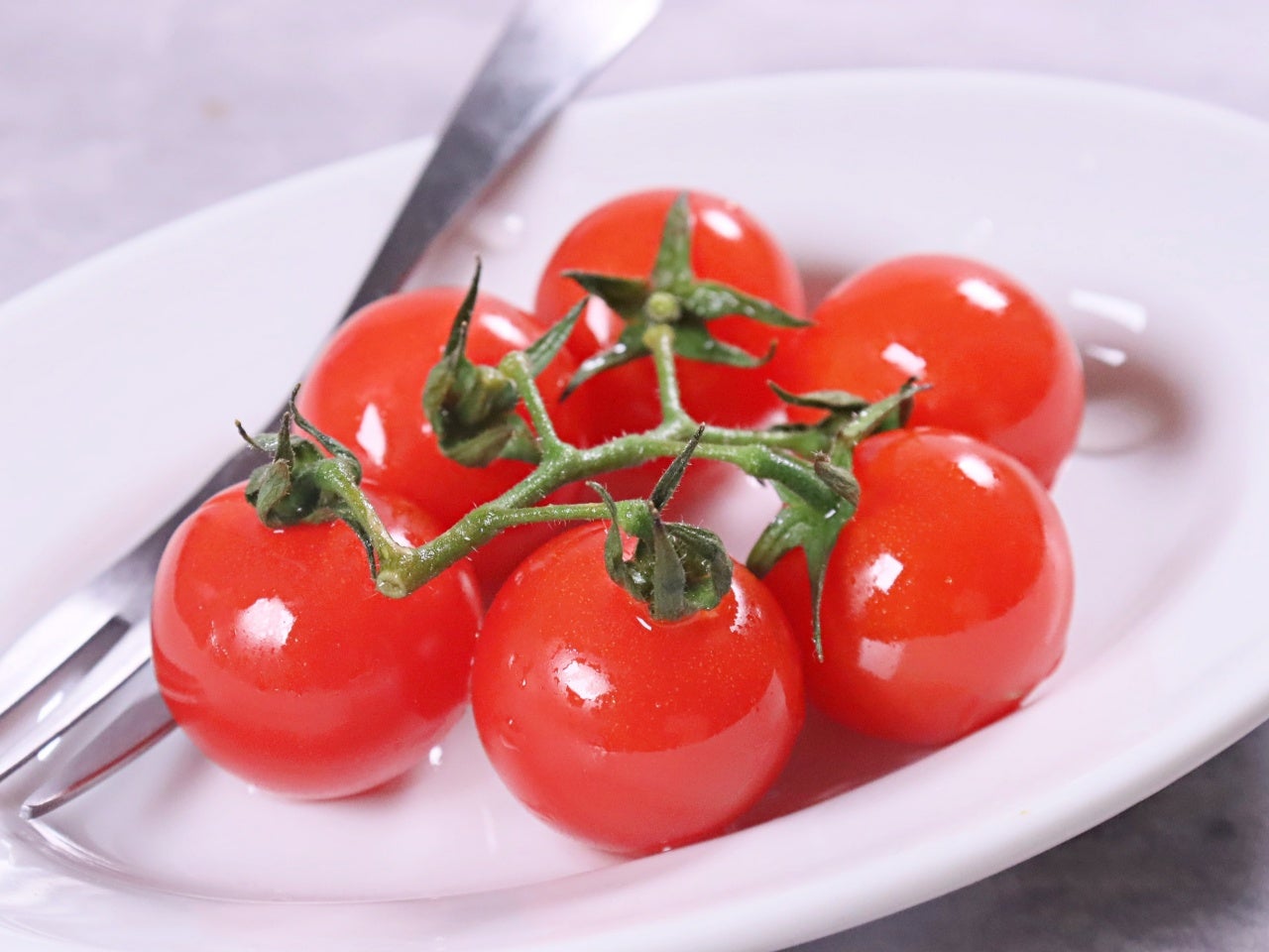プチトマトは、フォークなどで小さい穴をあけるか湯剥きをして。