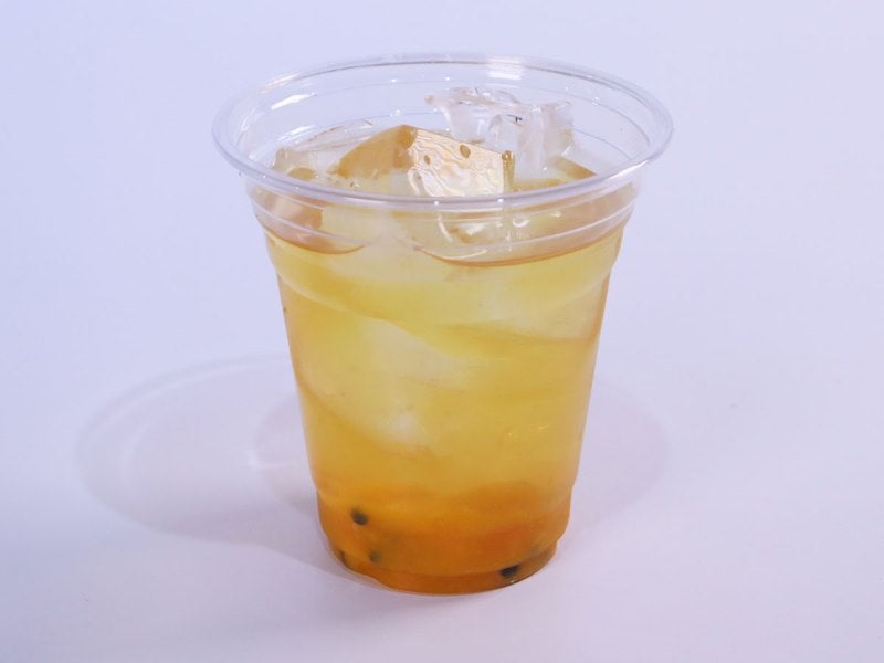- カップに氷を入れて「パッションフルーツソース」を入れる。