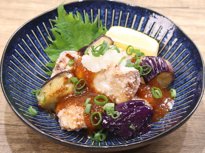 - お皿に「大葉」を敷いて①と解凍した「揚げなす乱切り」を盛り付ける。