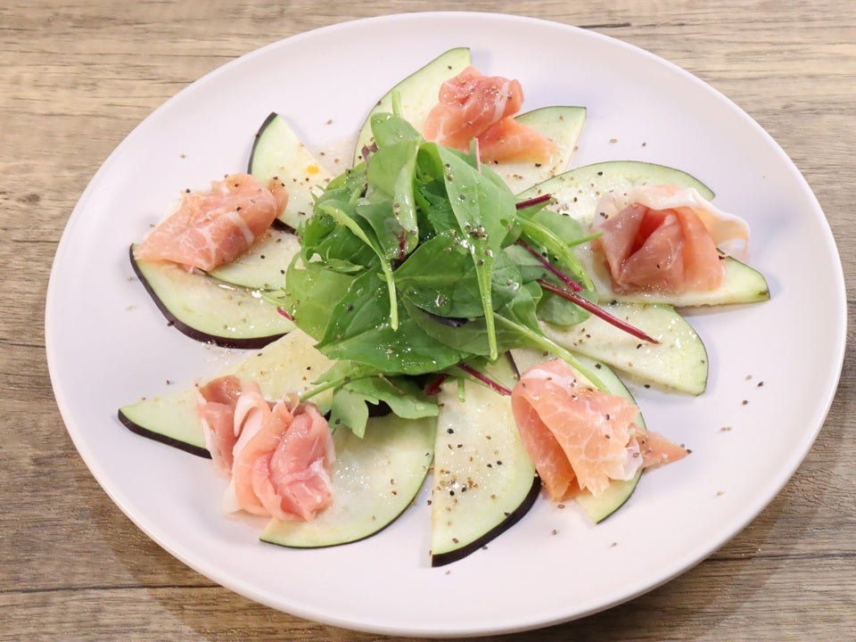 - 「泉州水なす」を皿に並べ、「生ハム(モモ)切り落とし」と「ベビーリーフ」を盛り付ける