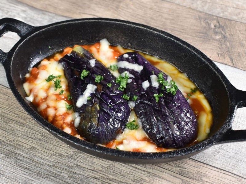 - スキレットに「ボロネーゼ」を敷き、「揚げなすハーフカット」を盛り付ける。