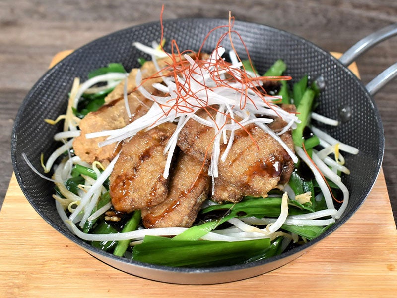 - 熱した鉄板に③を盛り付けて、白髪ねぎにした「長ねぎ」と「糸切り唐辛子」を乗せて提供。