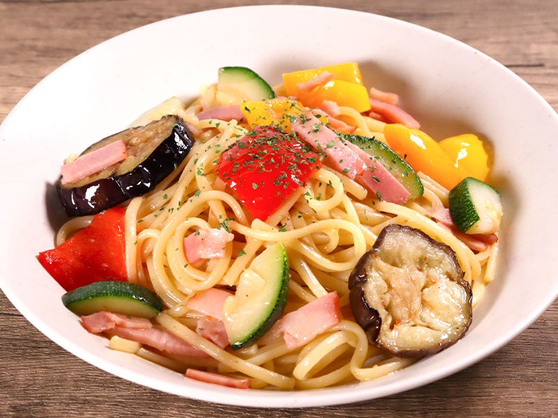 - フライパンに「オイルソース(ガーリック&赤唐辛子)」を敷いて、「ベーコン短冊」「グリル野菜ミックス」を炒める。