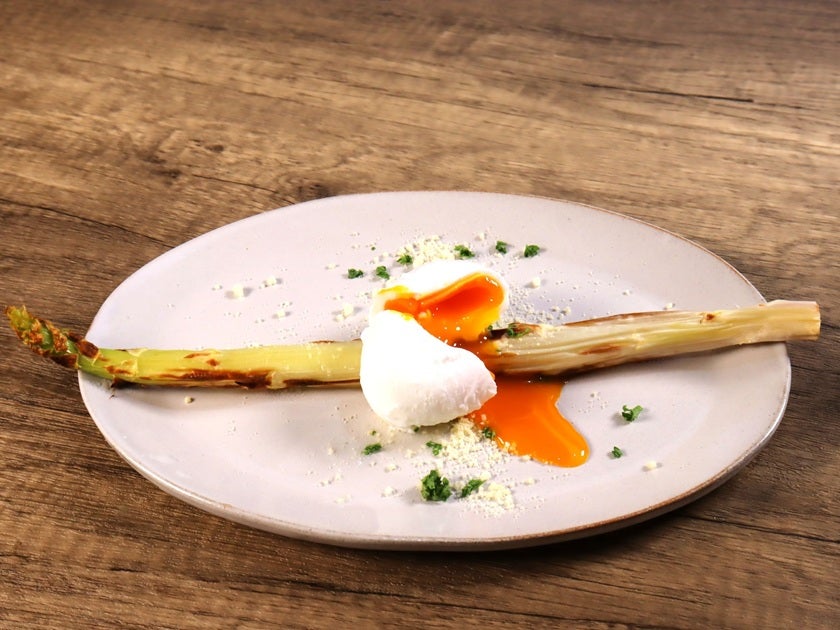 - フライパンに「EXVオリーブオイル」を入れ、「ホワイトアスパラ」をじっくり焼き、「アルペンザルツ(岩塩)」を振りかける。