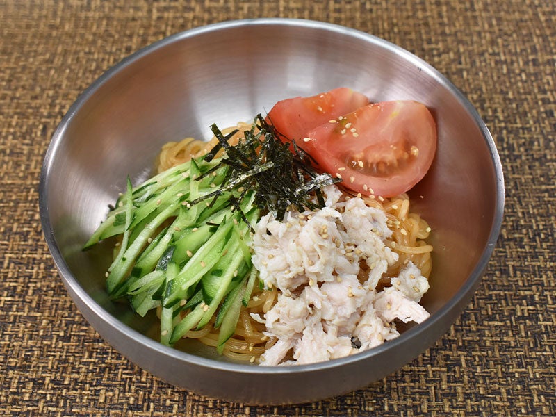 - 解凍した「蒸し鶏ほぐし身」、串切りカットした「トマト」、千切りにした「きゅうり」を盛り付ける。