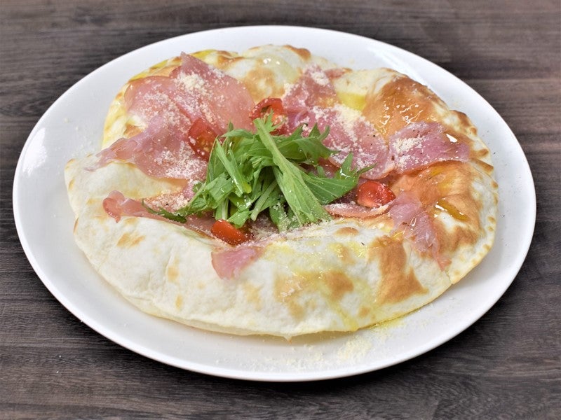 - ある程度膨らんだら穴が開かないようにそっと取出し、カットした「水菜」「生ハム切り落とし」をトッピングし、「オイルトリュフ」かけ「パルメザンチーズ」を散らす。