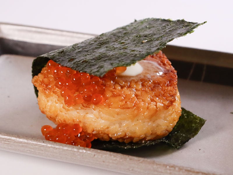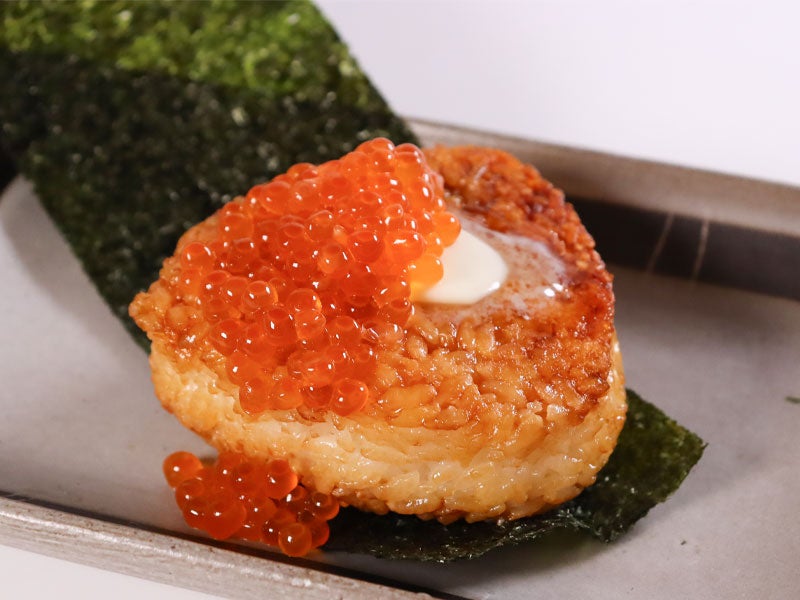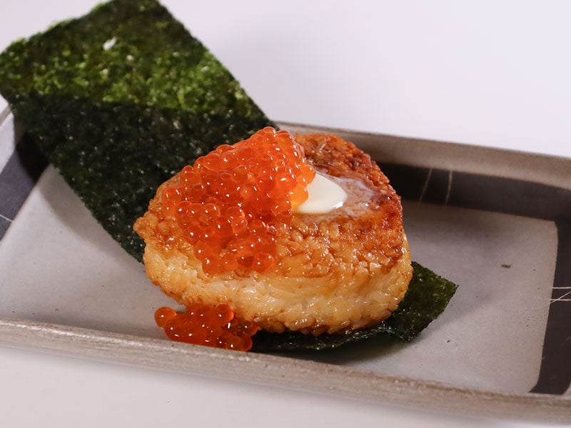 アツアツの焼きおにぎりにバターをのせました。いくらもトッピングして単価UP!