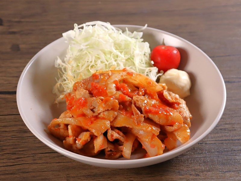 - お皿に千切りにした「キャベツ」を盛り、②を盛り付ける。