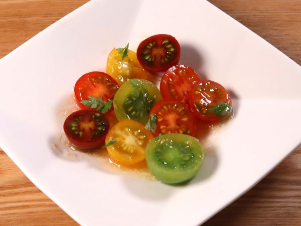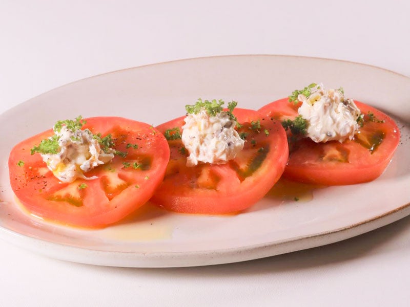 - 「いぶりがっこクリームチーズ 」をトマトの上に盛り付ける。