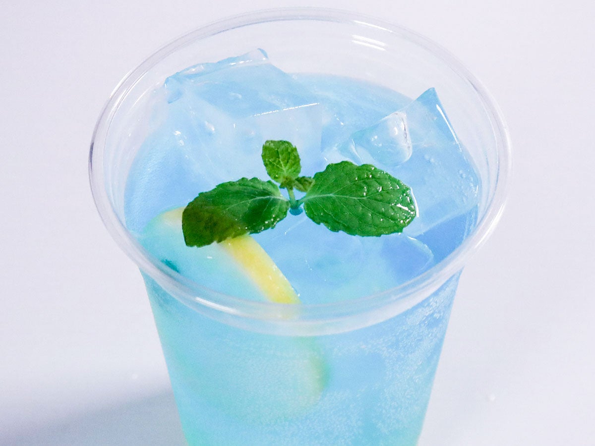 ライチ味のシロップを使用した青色のレモンスカッシュです。 青色が目を引く、夏にピッタリのドリンクです。