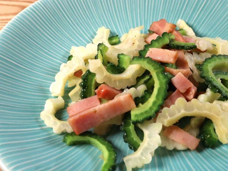- 「白ゴーヤ」「ゴーヤ」「ベーコン拍子切り」をいため、「味付塩コショー」と「オイスターソース」で味付けし完成です。