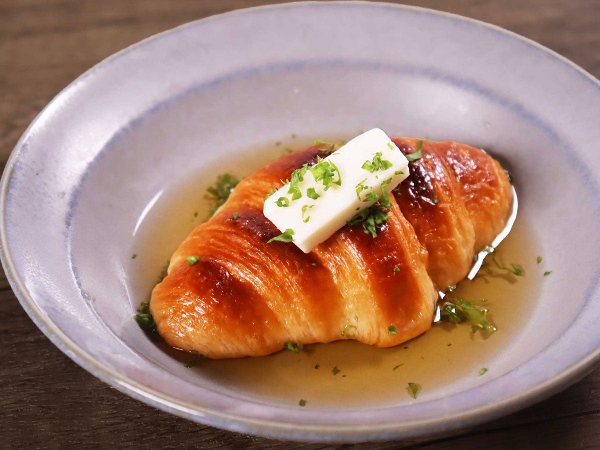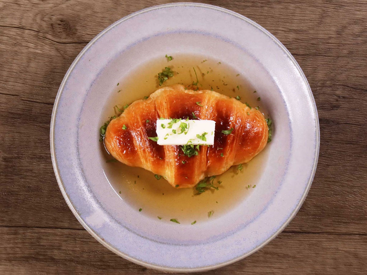 おでんの具材にクロワッサン⁉ ダマされたと思って試してほしい! だしをたっぷりと吸ったクロワッサンがクセになります! ※クロワッサンがおでんだしをすぐに吸ってしまうので、提供直前に合わせるようにしてください。