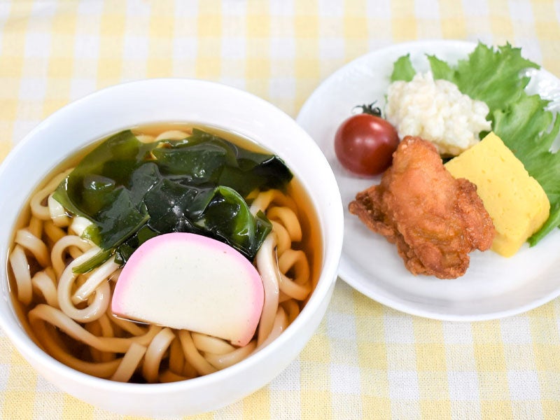 - 「讃岐うどん」を湯がき、①に入れて「かまぼこ」と戻した「乾燥カットわかめ」をのせる。