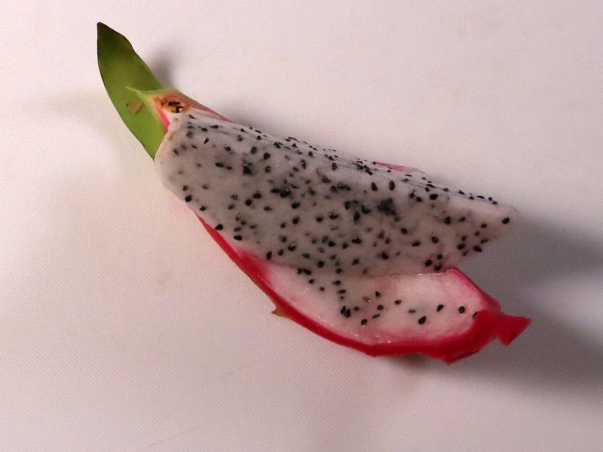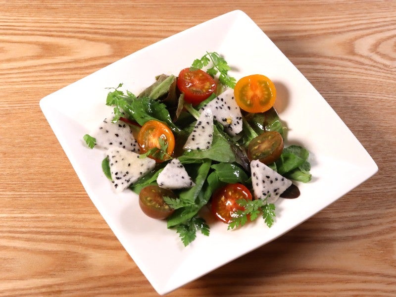 最近、たまーにスーパーで見かけるようになってきたドラゴンフルーツ。ごっつい見た目とは違って優しいお味。キウイに近い食感です。優しい味なのでサラダにしてもほかの野菜とも喧嘩しません! あまり見ない食材で他店と差別化できるかも。ぜひ試してみてくださいね。