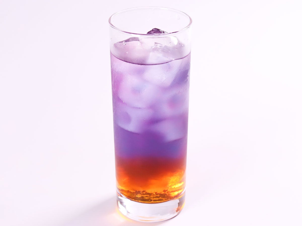 ハロウィンカラーのオレンジ色と紫色を使った不思議なドリンクです。 提供時は青色ですがレモンを絞ると紫色に変わります。 ぜひ、レモンを別添えで提供してみてください!