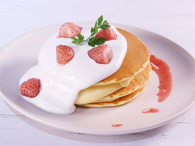 - 「ソフトホイップ」をたっぷりかけて「白いちご」を盛り付ける。