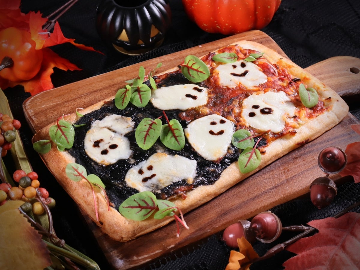 イカスミソースとピザソースで塗りつぶしたピザに、モッツァレラを載せて。いろんなおばけが楽しそう!
