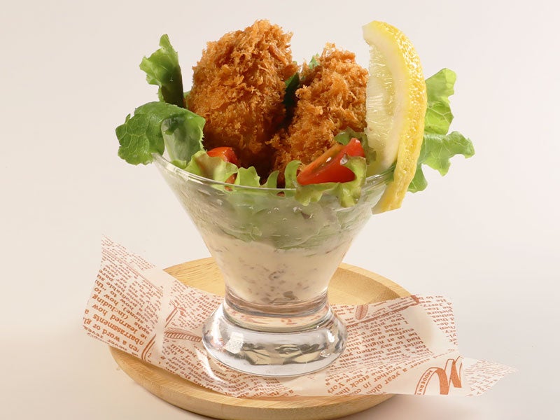 - 器に「ベビーリーフ」の大きい部分を外側に広げ、①.の「カキフライ」を入れる。