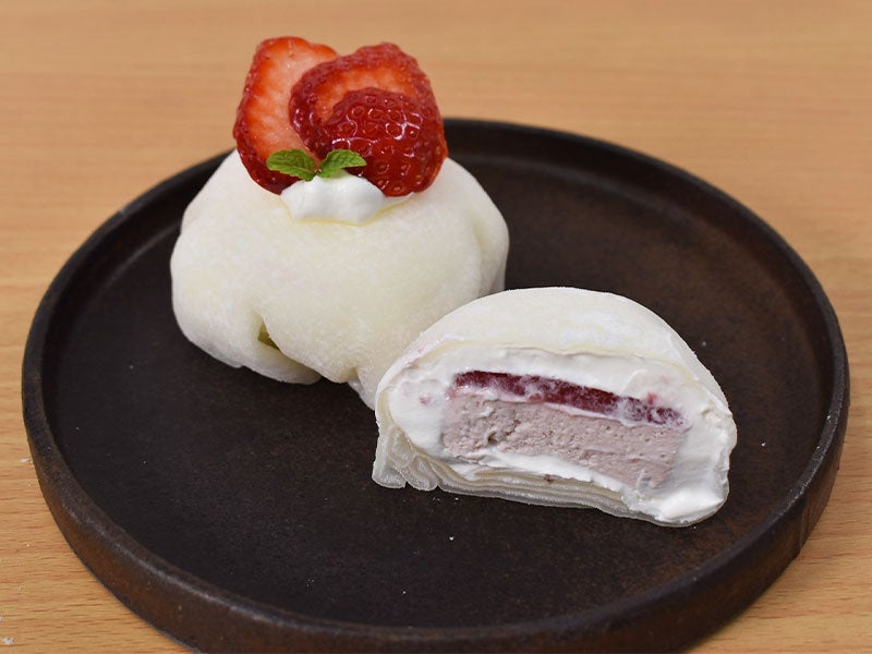 - ひっくり返して皿に盛り付け、「ホイップ」と「いちご」「スペアミント」を飾り、提供。