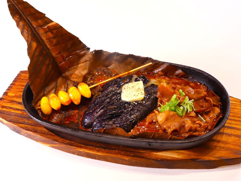 - 水に戻した「朴葉」を鉄板に敷き、解凍した「牛コマ」「しいたけ」「なすハーフカット」を乗せ、上に「田楽みそ」をトッピングする。