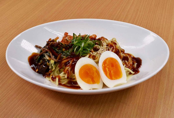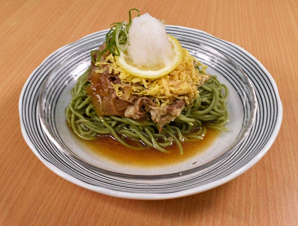 - 「うどん」を冷凍のまま500wレンジで3分40秒温め、冷水で冷やし、皿に盛る。
