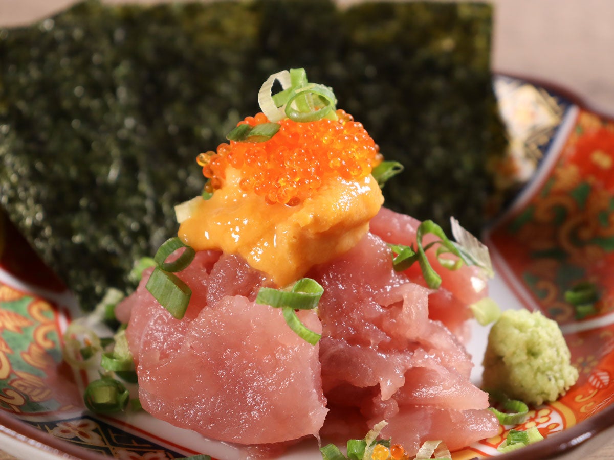 使い切りで超便利!まぐろのスキミを使ったおつまみです。 うにやとびっ子を乗せて単価UP!