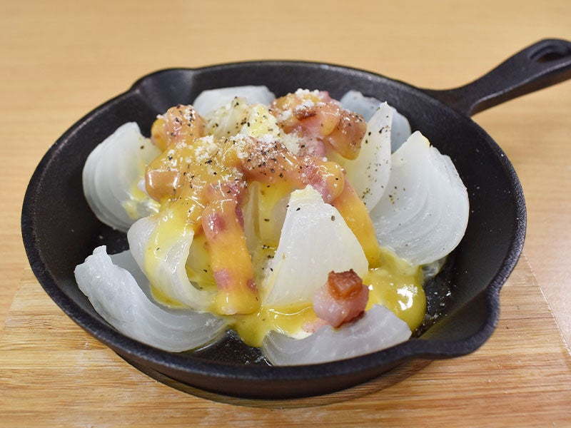 - スキレットに移し、「パスタソース カルボナーラ」を回しかけ、「パルメザンチーズ」「ブラックペッパー」を振り提供。