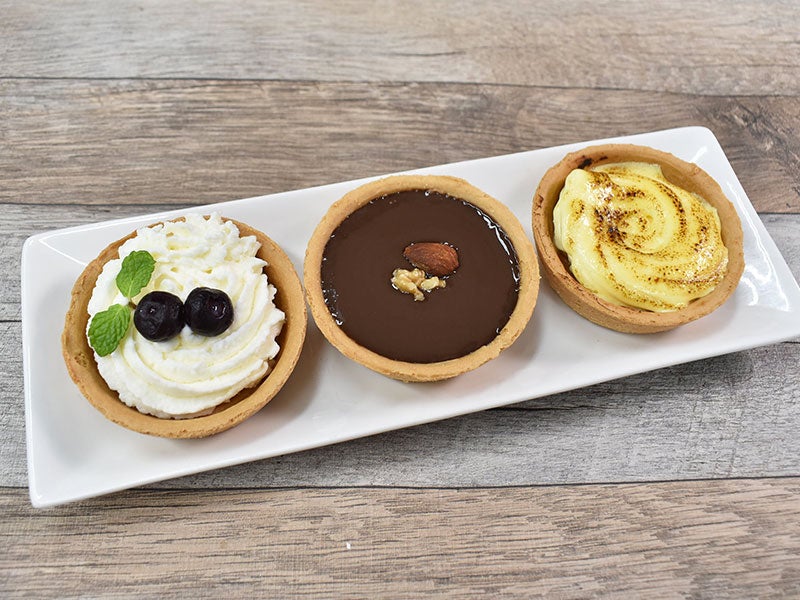 - 【チョコプリンタルト】 手順:「クッキータルトカップ」に湯せんで溶かした「チョコレートプリン」を流し入れ、「ミックスナッツ」を飾った後、冷蔵庫で冷やし固める。