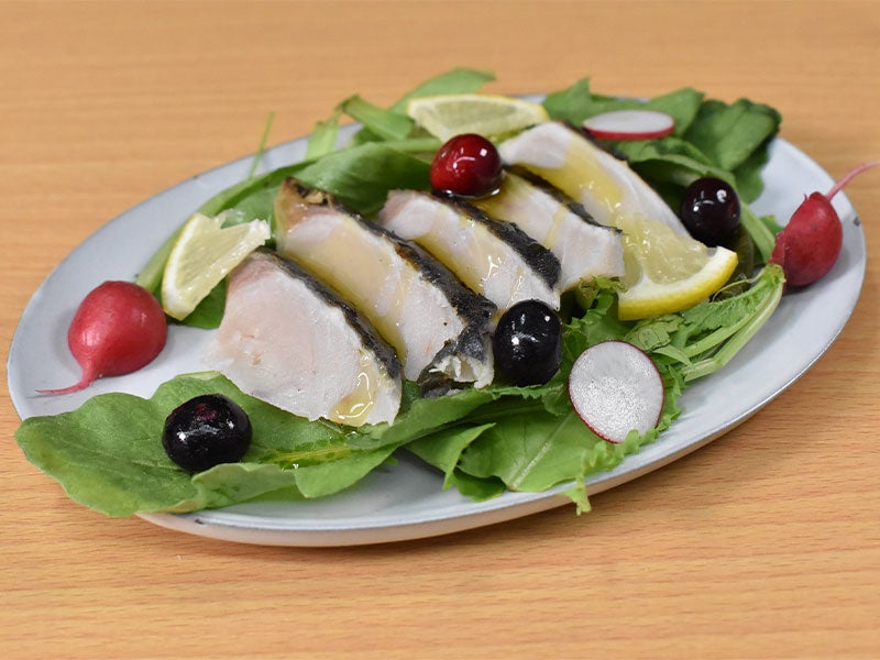 - 「とろさわら」を半解凍し、薄くスライスする。