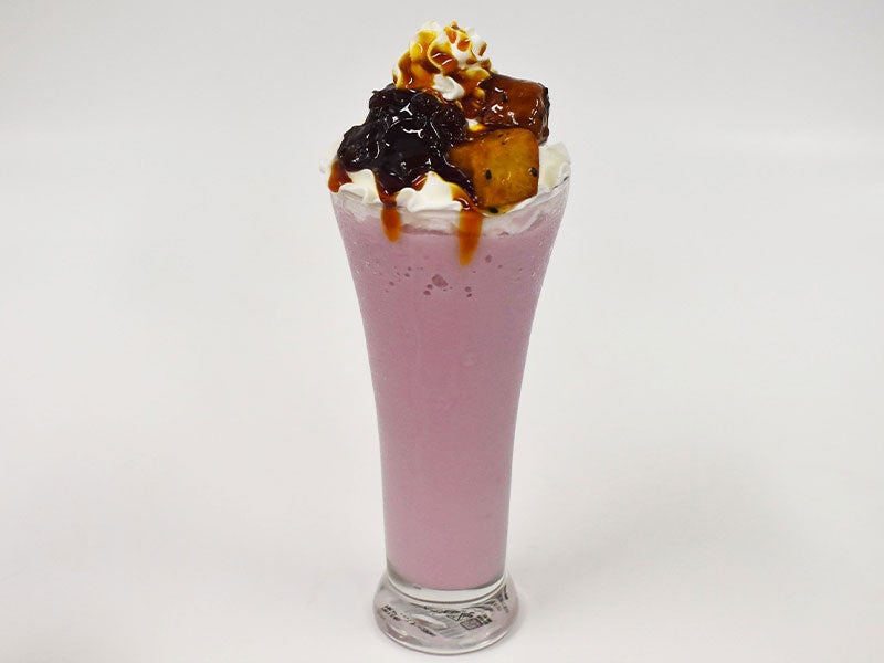 - 「雪氷」と「牛乳」をシェイク状になるように調整しながらよく混ぜ合わせ「モナン パープルスイートポテト」を入れて味を整え、グラスに注ぐ。
