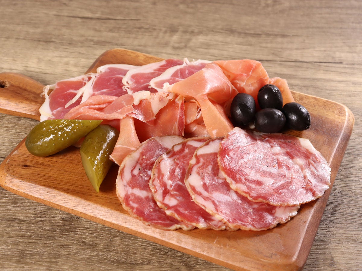 - 「生ハムサラミ3種盛り合わせ」を解凍し、皿に盛り付ける。