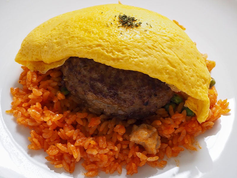 - 「チキンライス」の袋に数箇所穴をあけ、レンジ(500W)で約5分間加熱して皿に盛り付ける。