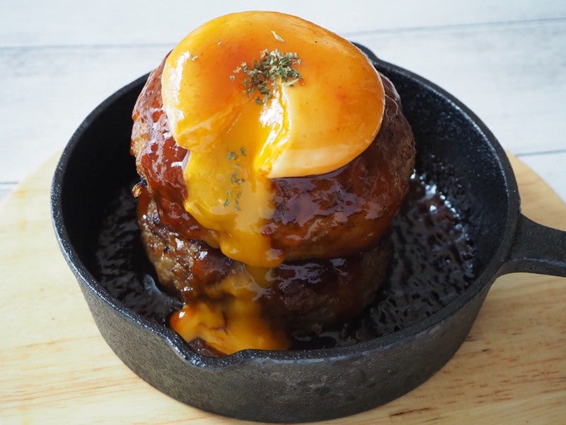 - スキレット鍋に①.を2個重ねて盛り付け、「ハンバーグソースデミグラ味」を上からかけ、再度スキレット鍋を火にかける。(少し熱々にする)