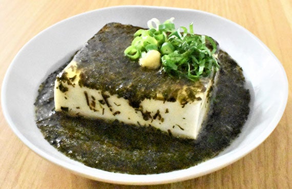 - 耐熱皿にのせた「絹豆腐」を500Wで約40秒レンジ加熱をし、水分を切ってお皿に移し、常温程度になった①.を全体にかける。