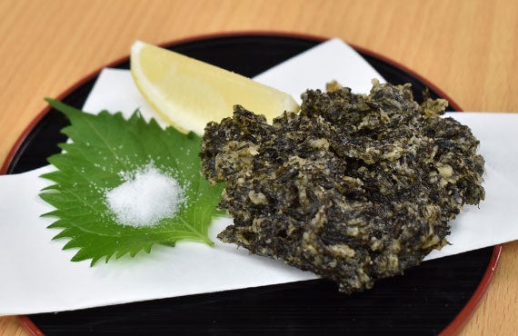 - 解凍済の「アカモク」に、「天ぷら粉」をあかもくと同量と水を少量(衣がまとまる程度)入れて、良くかき混ぜる。