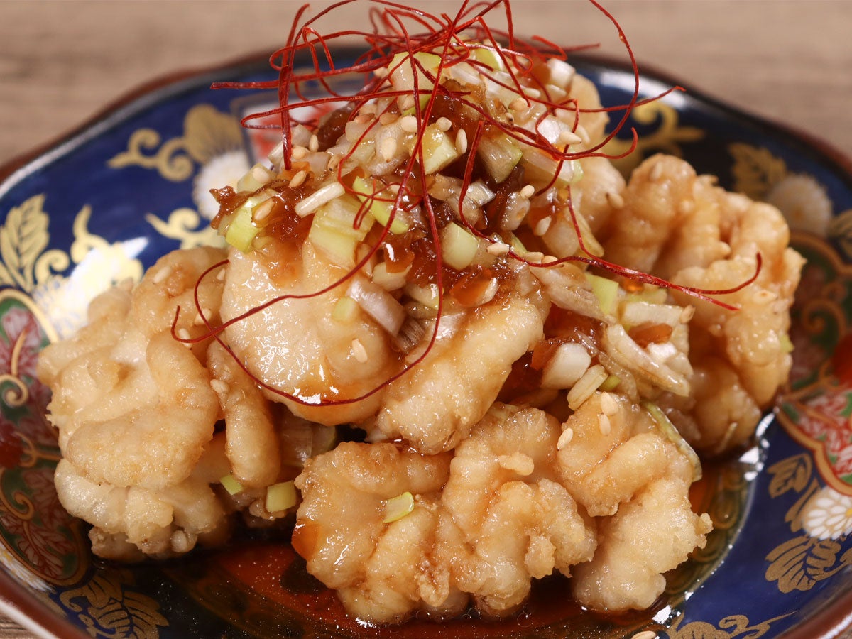 白子を揚げて、油淋ソースで和えました。 油淋鶏のたれは具材もたくさん入っていて本格的! 冬の季節メニューにいかがですか??