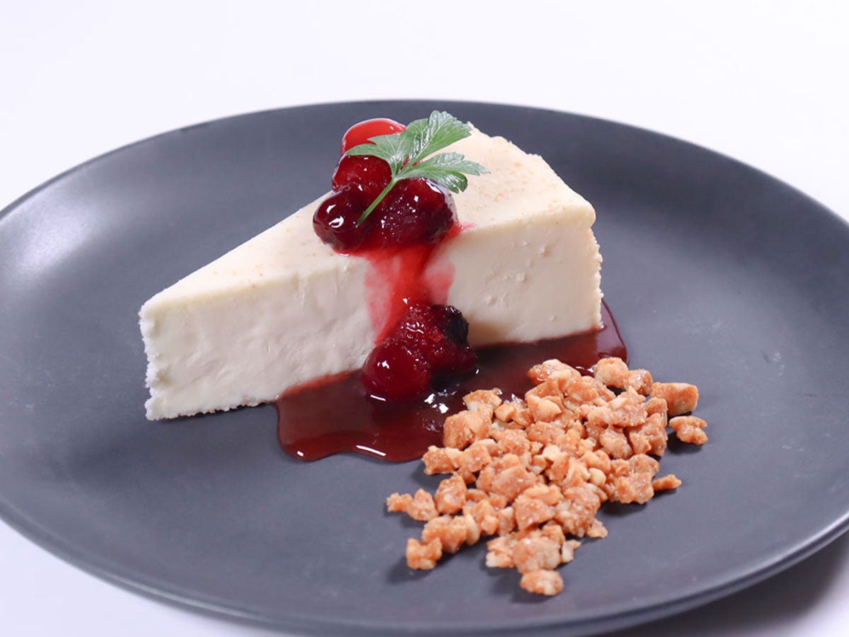 - 皿に「チーズケーキ」を盛り付け、「ミックスベリーのソース」をかける。