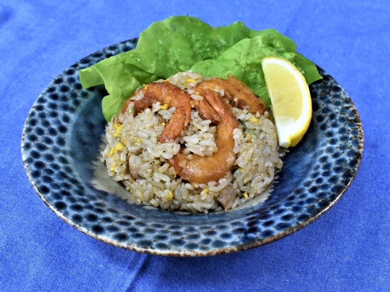 - お皿に、「サラダ菜」を敷き、①.の「炒飯」と「ガーリックシュリンプ」を盛り付け、「レモン」を添える。