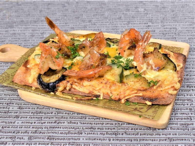 - 「角型クラスト」に「マヨネーズ」を塗り広げ、その上に冷凍のまま「グリル野菜ミックス」を並べ、最後に「サラダスパイス」と「ミックスチーズ」を全体に散らす。