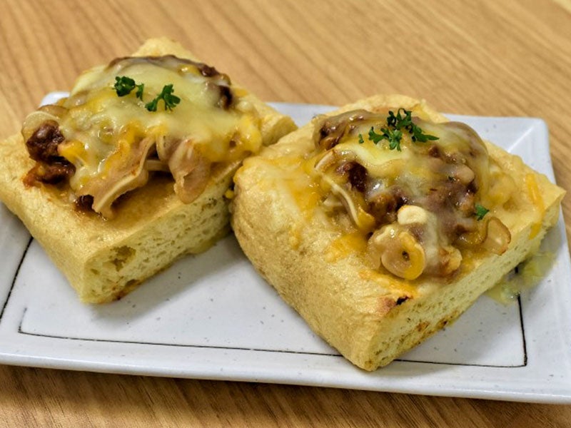 - 解凍済の「栃尾揚げ」をカットし、「ミミガースライス」「タコスミート」「ブレンドチーズ」を上に盛る。