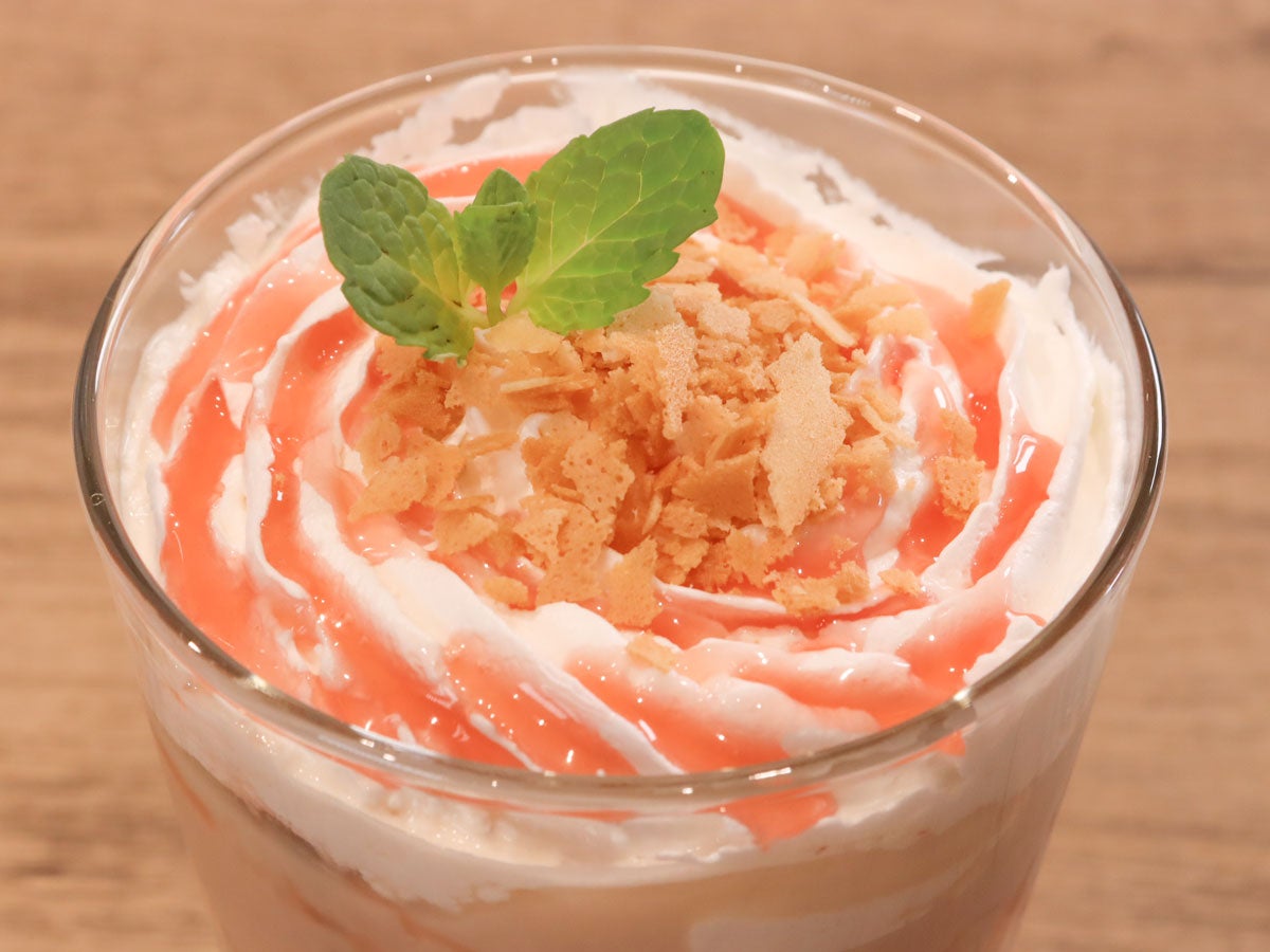- グラスの内側に「レッドベルベットソース」を回しかけて「つぶつぶ いちごネクター」を注ぐ。
