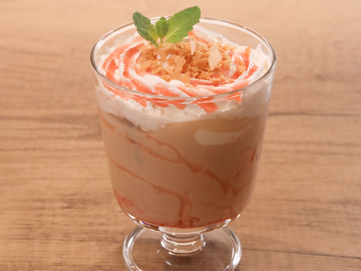 - 「牛乳 」、「チーズケーキシロップ」、「カフェオレシロップ」を混ぜ合わせ、ラテを作る。