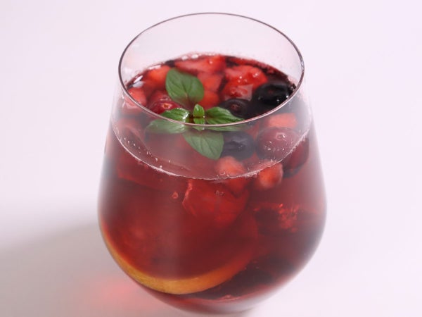 - グラスの内側に「レッドベルベットソース」を回しかけて「つぶつぶ いちごネクター」を注ぐ。