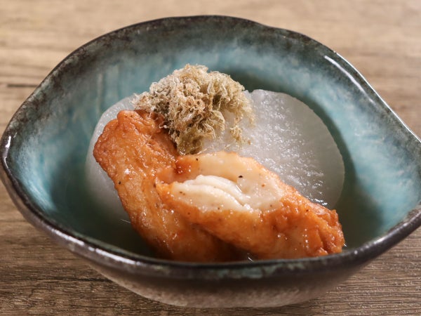 - 皿に盛り付けて「ごま」を振りかけ、「糸切り唐辛子」を乗せて提供。