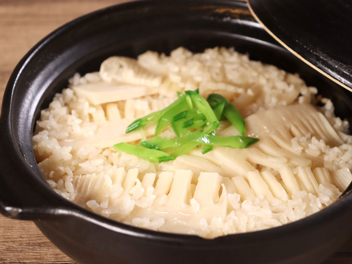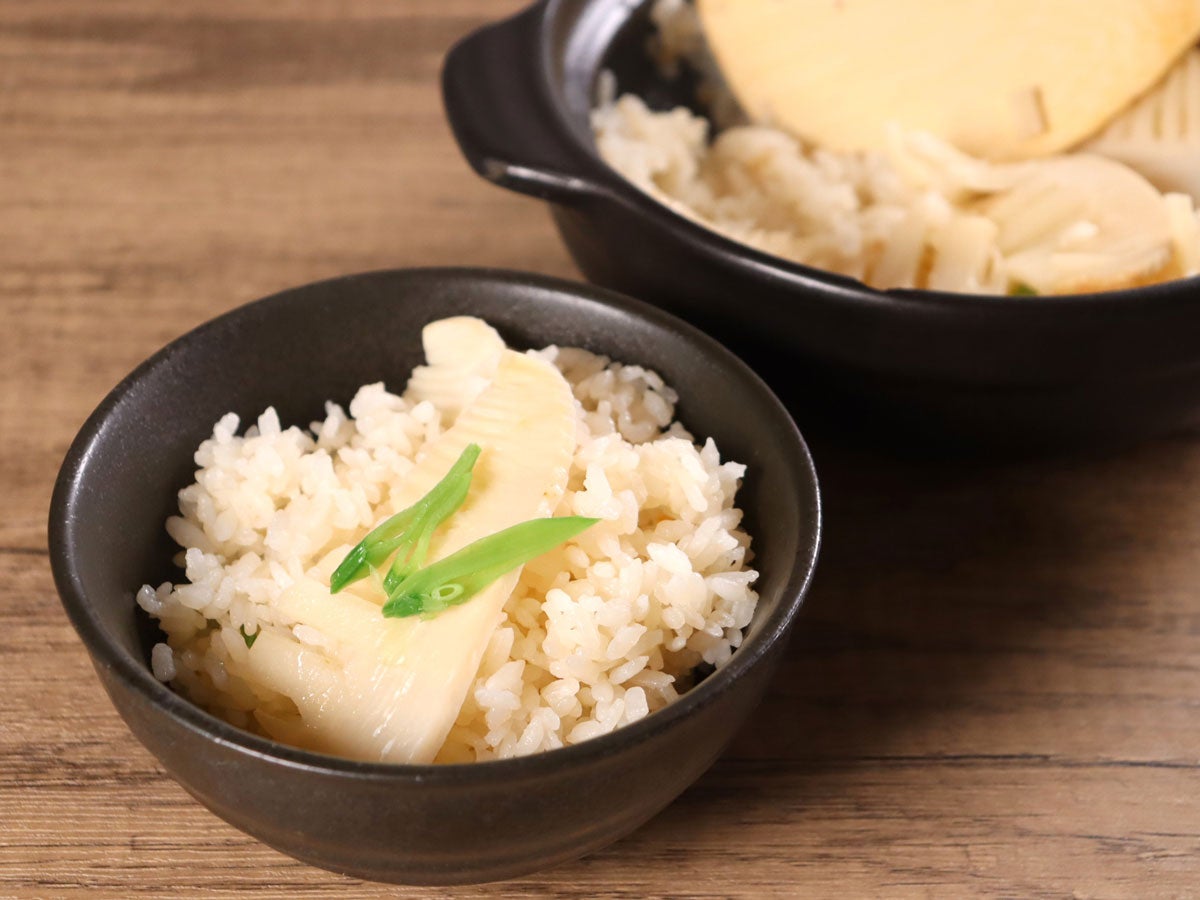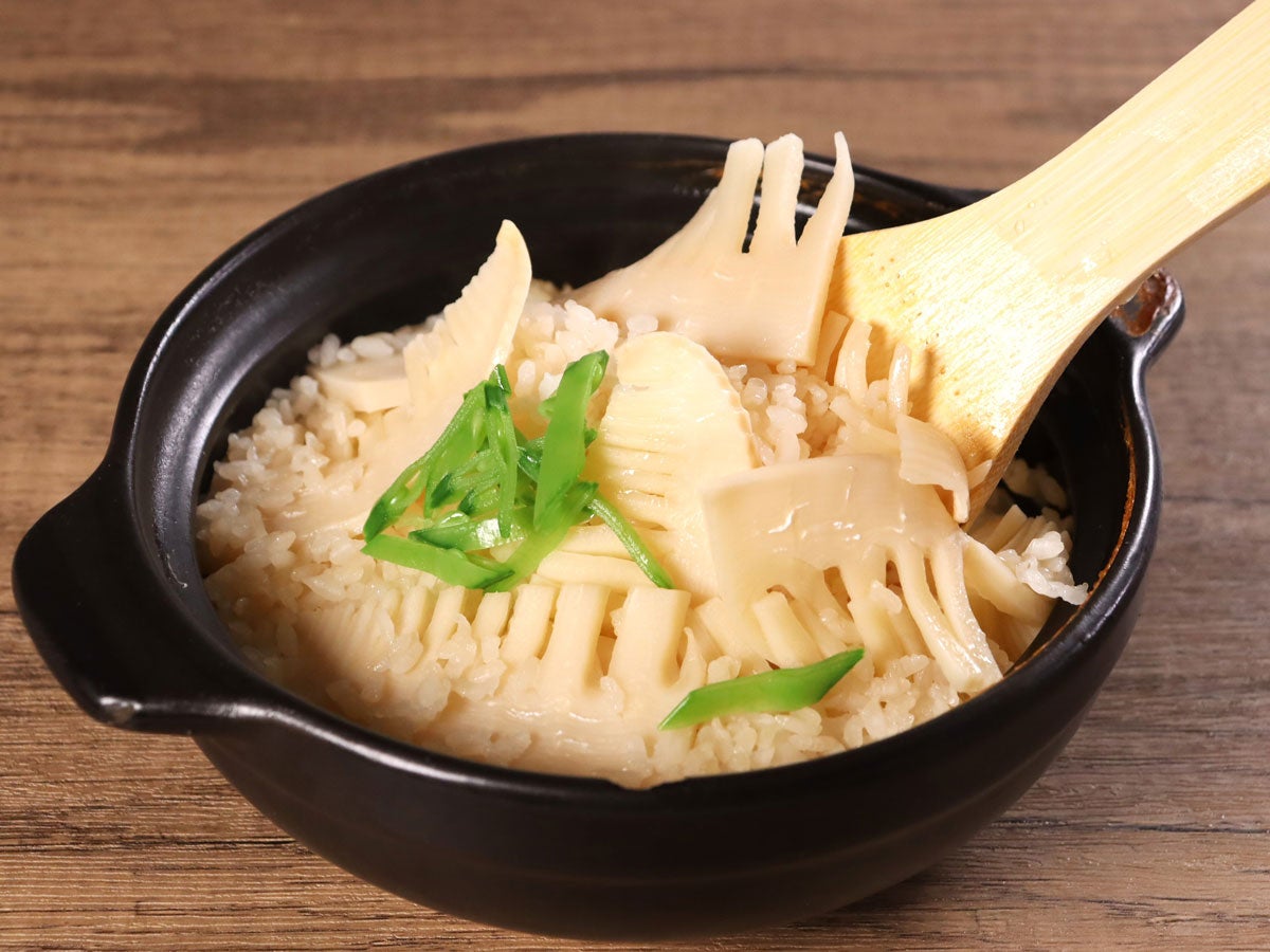 - ①の水気を切り、「水」を入れて、「たけのこ穂先スライス水煮 」「しらだし」を入れて炊く。