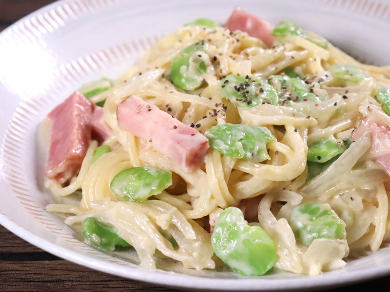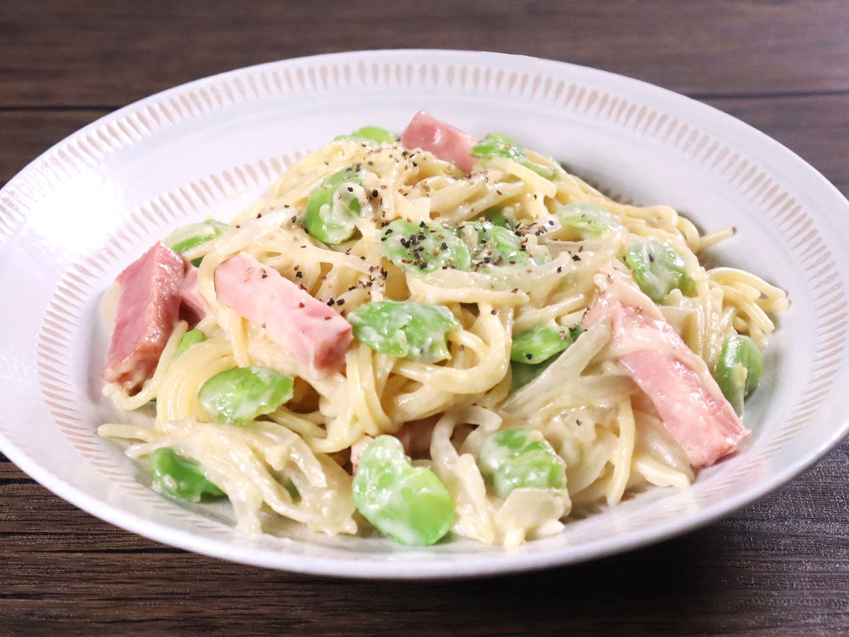 そら豆のほっくりとした食感と鮮やかな緑色、ベーコンの旨味と塩気がクリームソースと調和した、季節感あふれる一皿です。 そらまめは剥いてあるので必要な分だけ取り出せてロスもなく便利です。