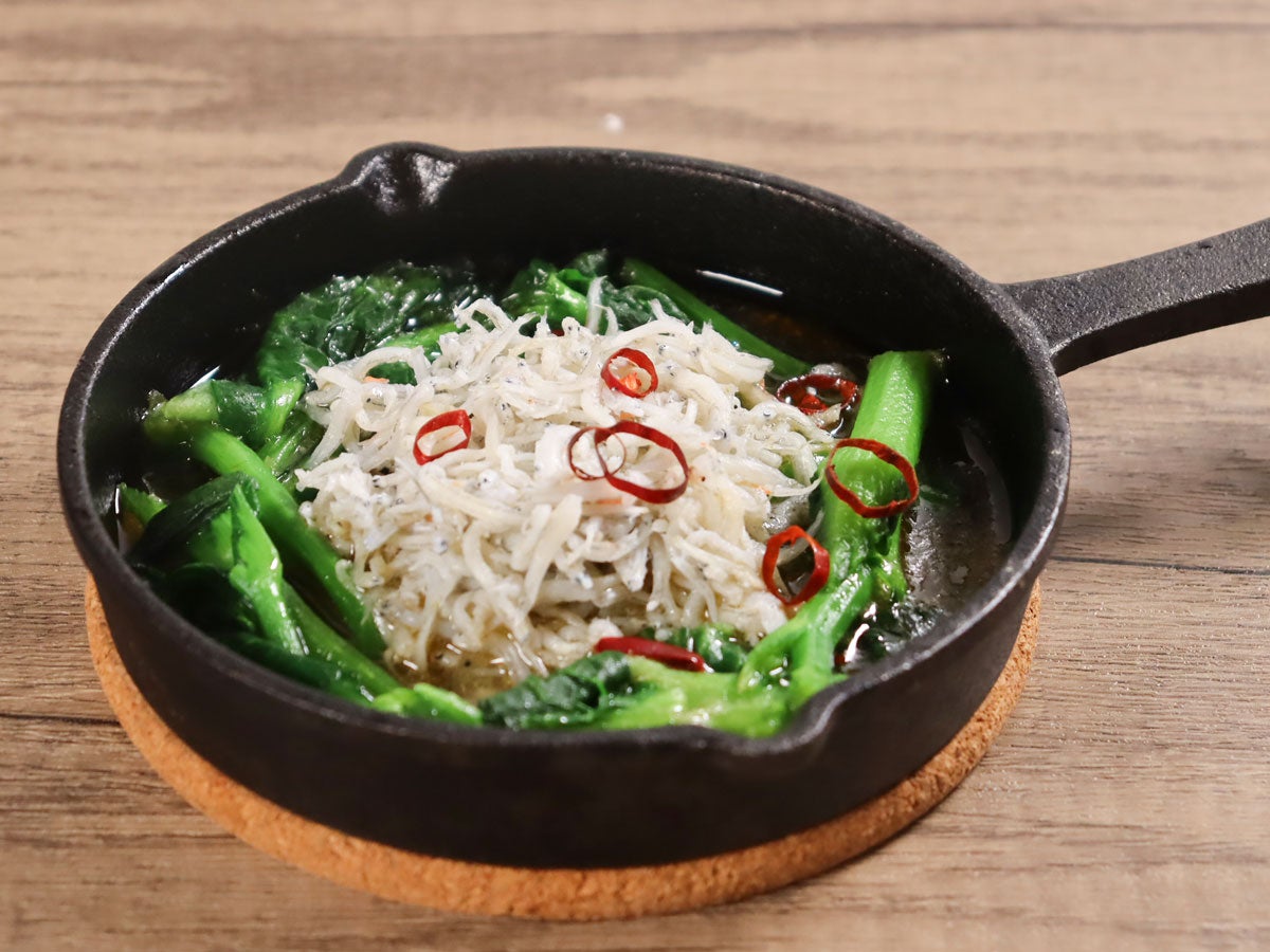 - 容器に「釜揚げしらす」「菜の花」「オイルソース」を入れ火にかける。