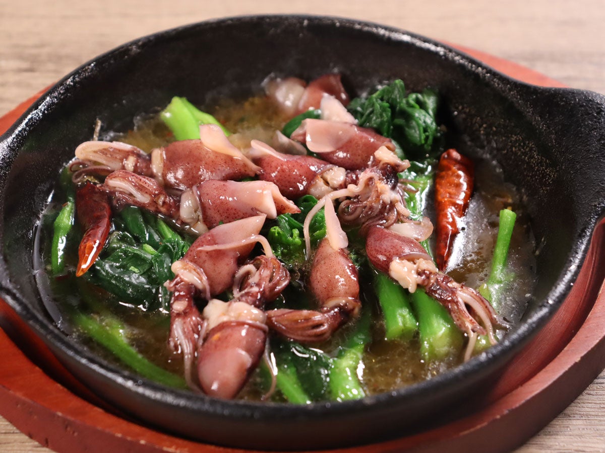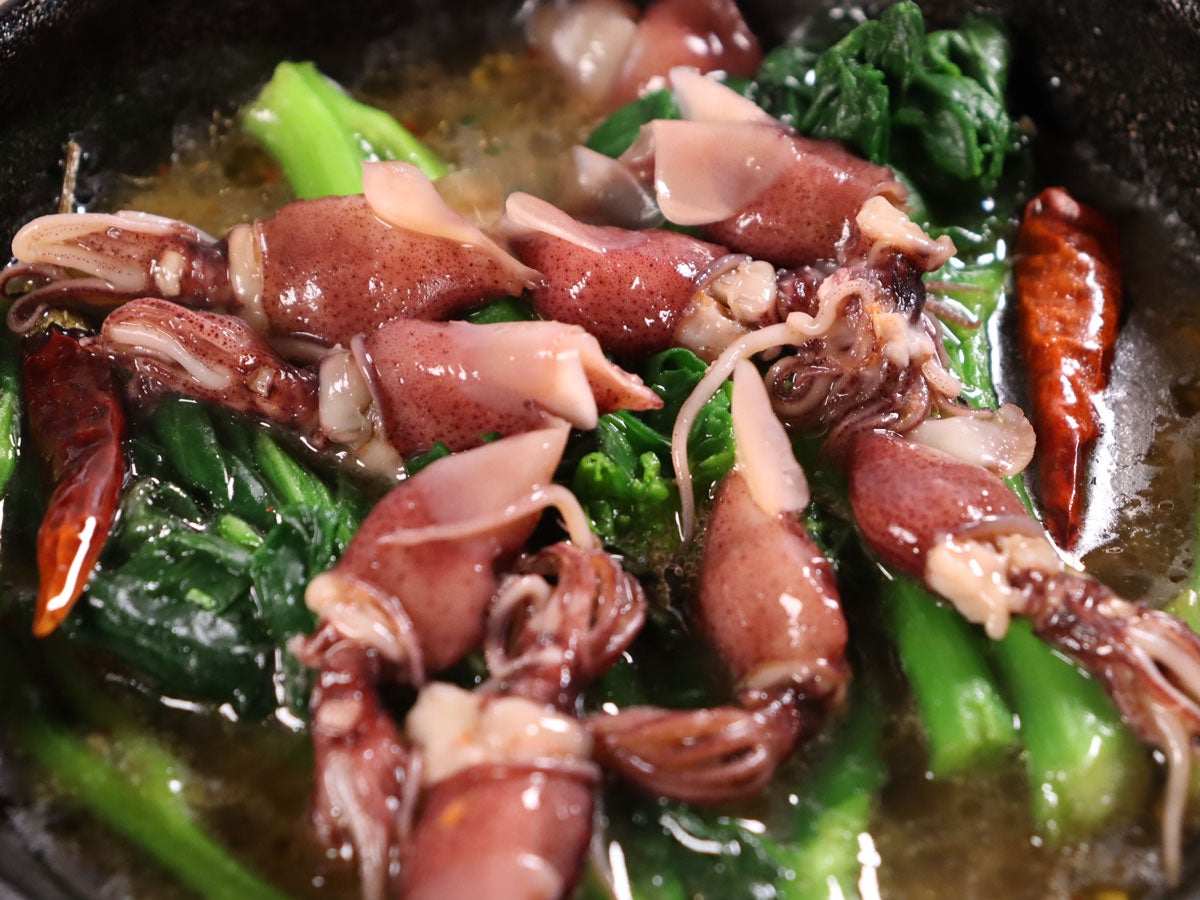 - 容器に「ホタルイカスモーク」「菜の花」「オイルソース」「鷹の爪」を入れ火にかける。
