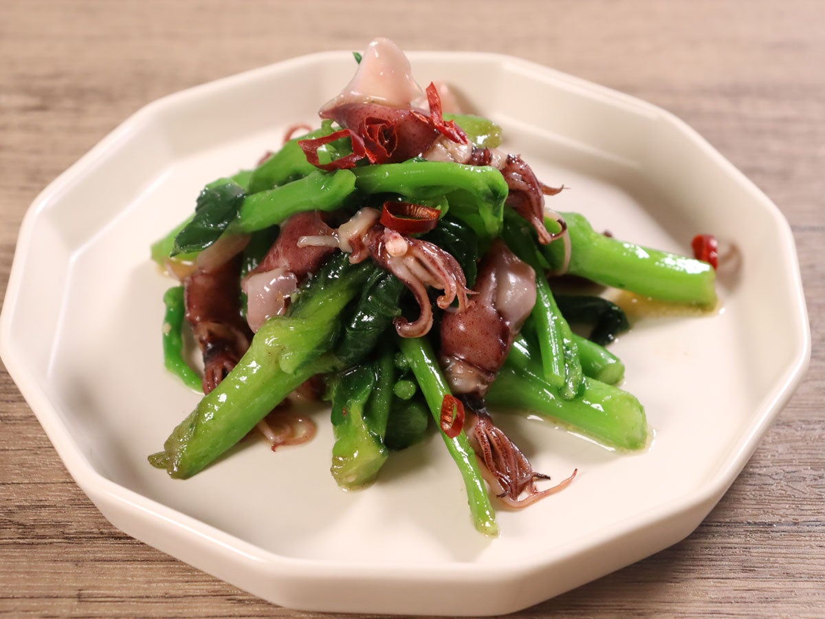 - 「ホタルイカスモーク」と「菜の花」を「輪切り唐辛子」を「オイルソース」で温まるまで炒める。